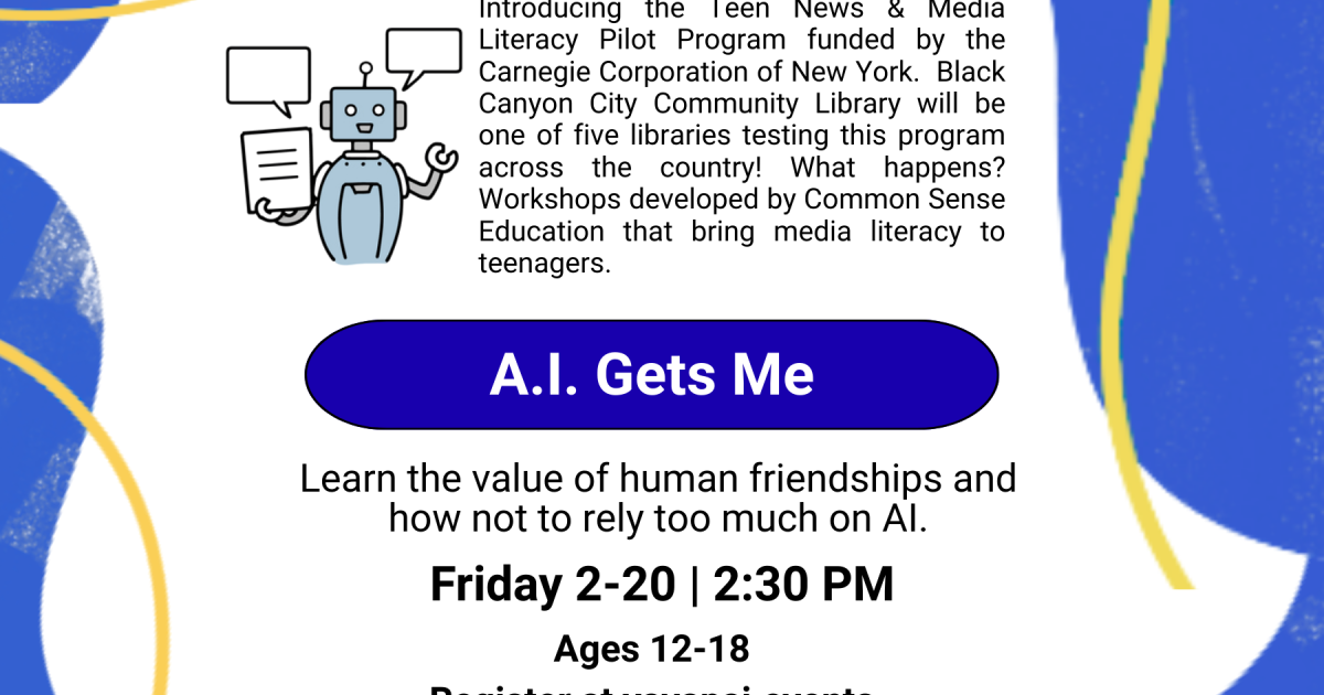 Introducing the Teen News & Media Literacy Pilot Program funded by the Carnegie Corporation of New York. Black Canyon City Community Library will be one of five libraries testing this program across the country! What happens? Workshops developed by Common Sense Education that bring media literacy to teenagers.