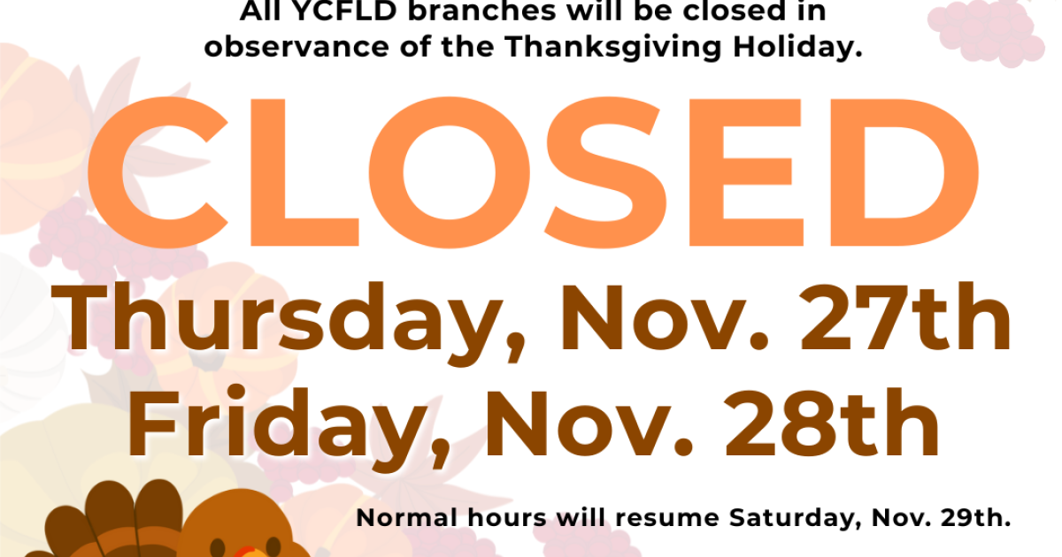 This closure with effect all YCFLD branches: Ash Fork Public Library, Bagdad Public Library, Black Canyon City Community Library, Beaver Creek Public & School Library, Clark Memorial Library, Congress Public Library, Cordes Lakes Public Library, Crown King Public Library, Dewey-Humboldt Town Library, Mayer Public Library, Paulden Public Library, Seligman Public Library, Spring Valley Public Library, Wilhoit Public Library, and Yarnell Public Library.