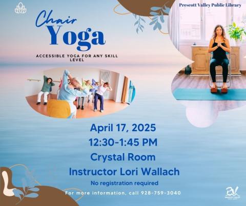 Looking for a way to relax, stretch, and improve your balance without getting on the floor? Join us for Chair Yoga at the Prescott Valley Public Library on Thursday, April 17th, 2025, from 12:30 – 1:45 pm! This in-person class is perfect for all levels, whether you're new to yoga or looking for a gentler practice.