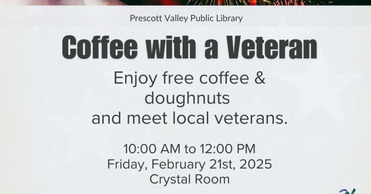 Prescott Valley Public Library will be hosting Coffee with a Veteran on Friday, February 21st, 2025, from 10:00 am-12:00 pm. Coffee for Vets is an opportunity for Veterans to socialize, connect with the community, and learn about community resources. This is a monthly event held on the third Friday of the month and is a time for veterans, service-members, and any member of the public to sit down and have a conversation while enjoying a cup of coffee and doughnuts.