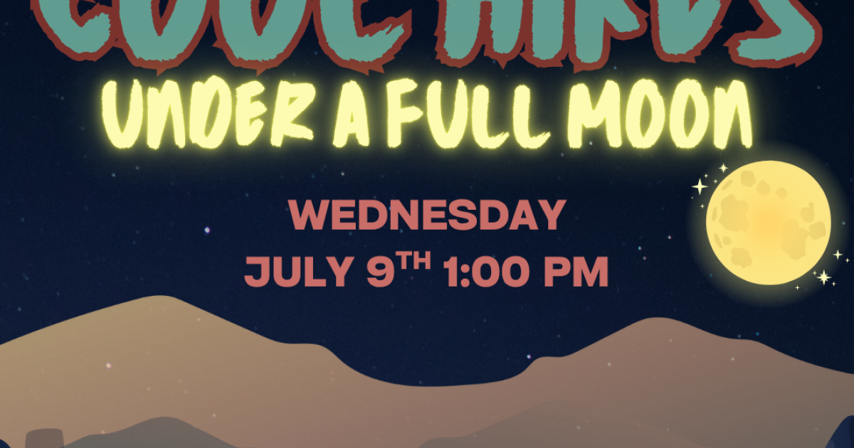 Join friends, neighbors and anyone who enjoys hiking in the great outdoors, featuring sites that are cool and lit up under a full moon. This time of year it is critical to hike cool and that involves hiking high and/or hiking at night. How? Where? We'll cover essential details like route selection and timing to maximize enjoyment while minimizing risk. Call Ted if you have any questions, 928-642-1295.