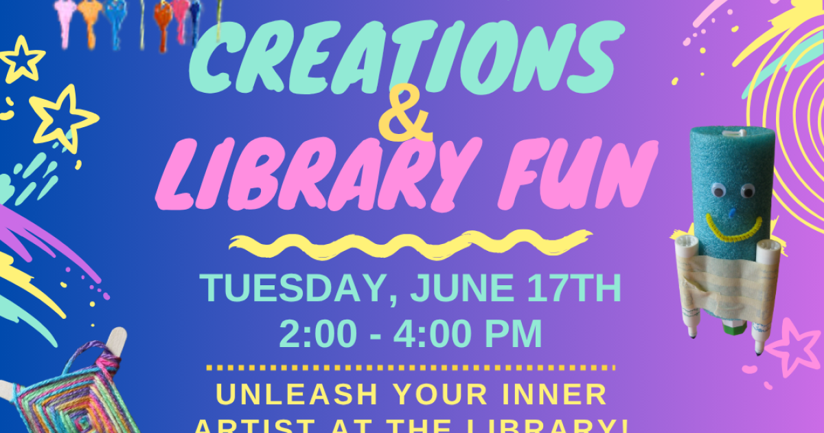 Unleash your inner artist at the library! Join us for a hands-on, creativity filled event where imagination takes center stage! Dive into spin painting, draw using a quirky art bots, craft stunning paper collages, design your very own monster hat, weave magic with popsicle sticks, and wind key chimes. Let your inner artist have some fun!