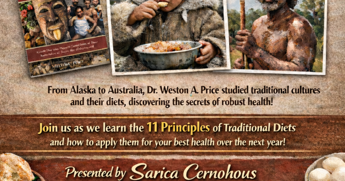 What is a healthy diet? Together, let's explore the work of Dr. Weston A. Price who researched and recorded groups of people from around the globe, from Alaska to Australia, living in a traditional way, eating their traditional diets, and enjoying robust health! Over the next year, we will meet for an hour to learn the 11 beneficial principles of traditional diets and how to put this to use today to support your best health!