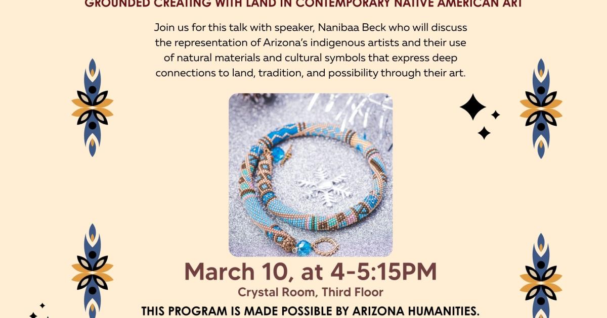 Join us at Prescott Valley Public Library on March 10, 2026 from 4-5:15PM for an in-person talk with Nanibaa Beck, who will explore the representation of Arizona’s Indigenous artists and their powerful use of natural materials and cultural symbols. This engaging presentation highlights how art expresses deep connections to land, tradition, identity, and possibility, offering insight into the stories and meaning behind these creative traditions.This program is made possible by Arizona Humanities.