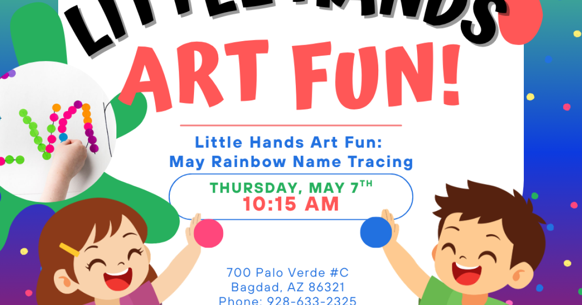 Little Hands Art Fun May Rainbow Name Tracing! Join us at the Bagdad Library for this month's Little Hands activity-dot-tracing fun for our youngest creators. Kids can trace their names using colorful dot stickers and cardstock, building fine-motor skills while creating something uniquely theirs. All supplies will be provided. Bring the family and enjoy a playful, hands-on craft moment together!