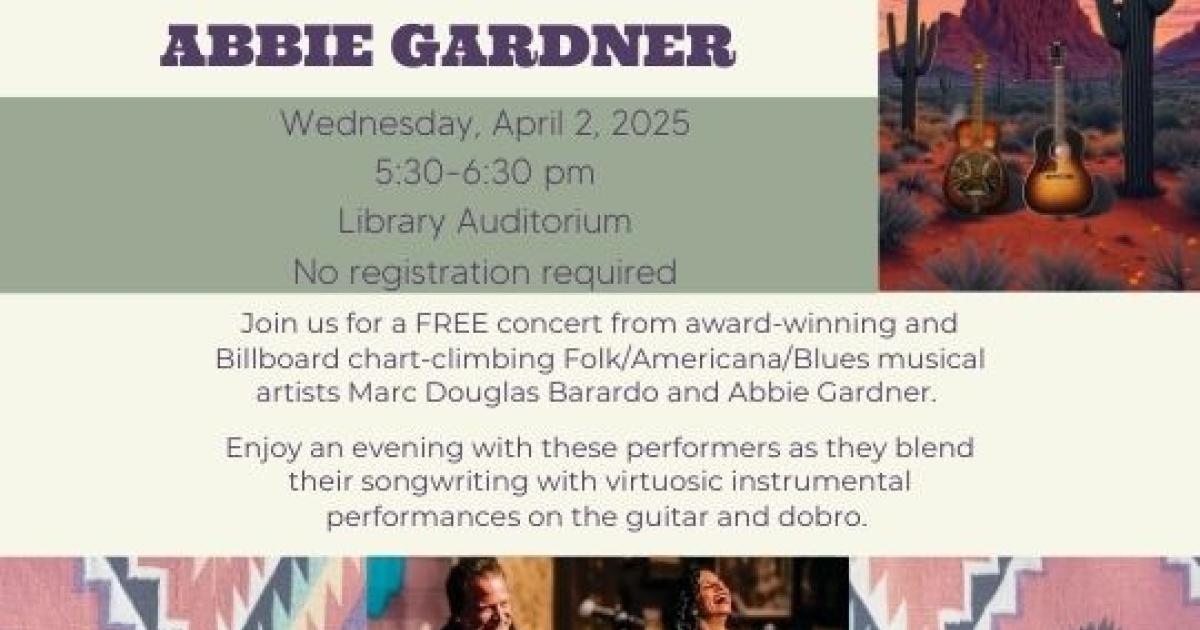 Don't miss a FREE concert featuring award-winning, Billboard-chart climbing Folk/Americana/Blues artists Marc Douglas Barardo and Abbie Gardner! Experience an unforgettable evening as they captivate with masterful songwriting and virtuosic performances on guitar and dobro. Join us for a night of incredible live music—you won’t want to miss it!