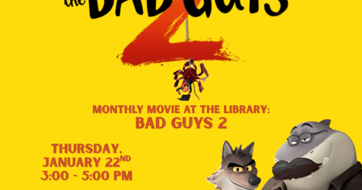 We’ll be showing the newly released sequel The Bad Guys 2 movie, This action-packed movie will be fun for the entire family to watch! Get ready for some action, laughs and a afternoon at the movies-library style! at the Popcorn will be provided — because every great movie needs a tasty snack! Come for the movie, snack on some popcorn & enjoy an afternoon at the library!