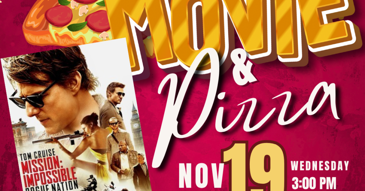 Join Friends and neighbors for a movie and pizza thanks to the Friends of the Library: "Mission Impossible, Rogue Nation" with Tom Cruise.