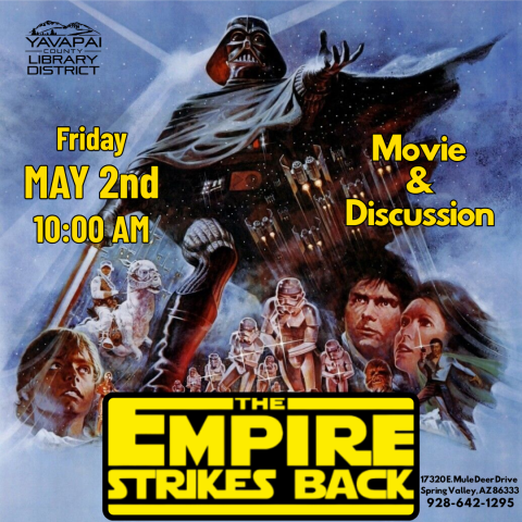 Join Friends and neighbors as discuss: "Star Wars: The Empire Strikes Back" with Mark Hamill. Luke Skywalker and the Rebel Alliance continue their star wars with the evil Empire of Darth Vader in the second film to be released in George Lucas's sci-fi series. Questions? Call 928-642-1295. Refreshments provided by the Friends of the Library.
