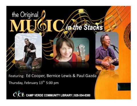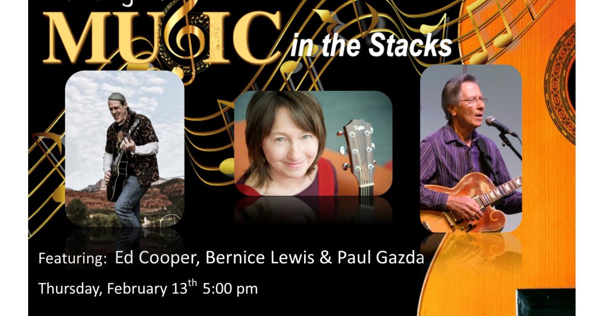 February's concert features Ed Cooper, Bernice Lewis & Paul Gazda.