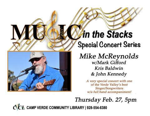 This month's concert features Mike McReynolds with Kris Baldwin & John Kennedy.