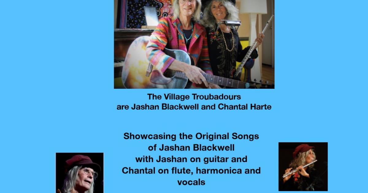 This month's concert features The Village Troubadours, a musical duo comprised of Jashan Blackwell and Chantal Harte.