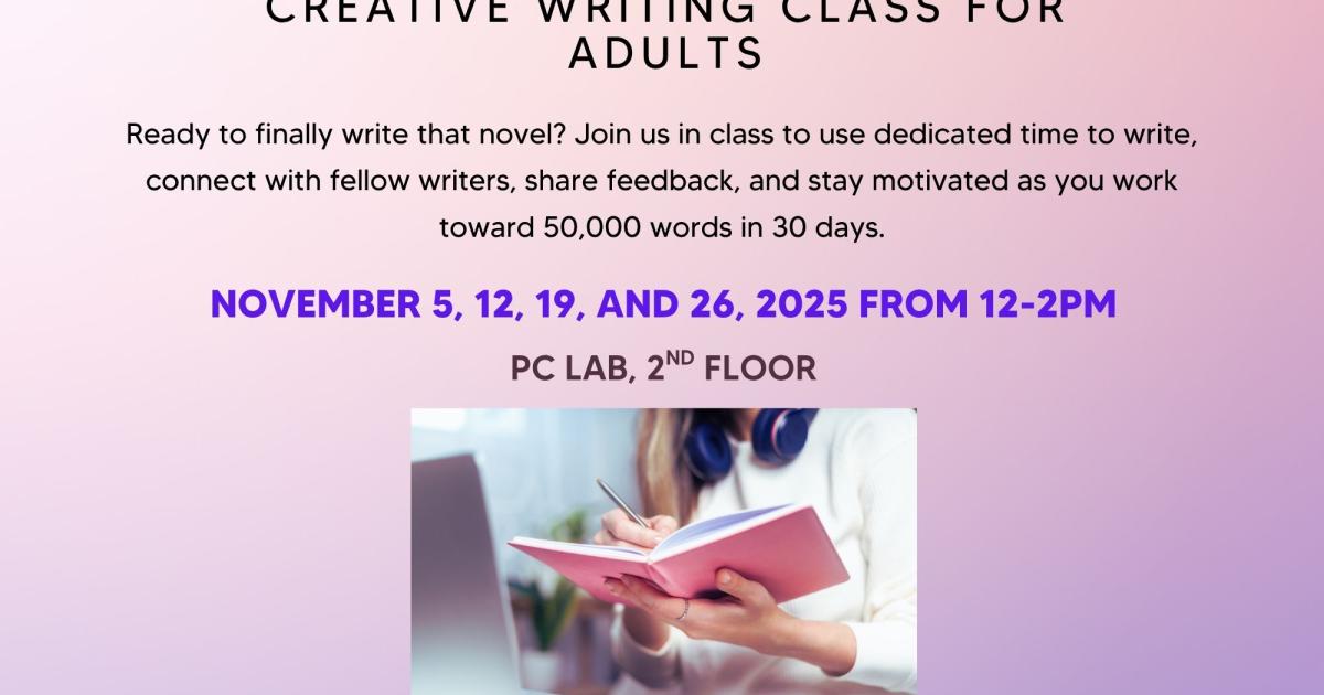 Join us this month while we participate in Novel November. Starting after midnight on November 1, writers across the world begin drafting a new novel, or a fresh rewrite of an old one, and attempt to finish by the end of the month. Join our Novel November Creative Writing Class and finally bring your story to life. Together, we’ll dedicate time each week to write, share resources, exchange feedback, and stay motivated as we work toward completing 50,000 words in 30 days. Push past writer’s block, connect with fellow storytellers, and by the end of the month you could be a novelist.