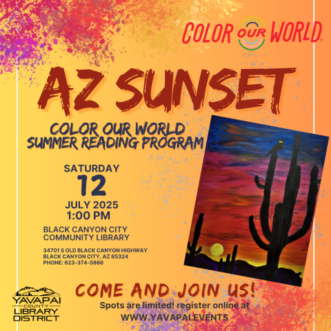 Learn to paint an Arizona sunset on canvas with Lesa Schuur. This program is part of the Color Our World Summer Reading Program and sponsored by the Black Canyon City Library Board.