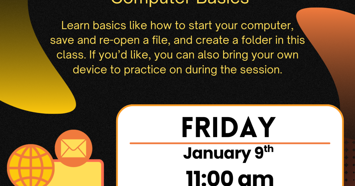 Primary tabs Upcoming List Month Week Day Remind Me Add To My Calendar Print Share Program Type: Computers & Technology Training Age Group: All Ages Program Description Event Details In person Computer Basics class. See Flyer or call library for questions.