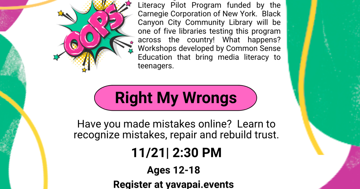 Ever make mistakes online? Introducing the Teen News & Media Literacy Pilot Program funded by the Carnegie Corporation of New York. Black Canyon City Community Library will be one of five libraries testing this program across the country! What happens? Workshops developed by Common Sense Education that bring media literacy to teenagers. In this workshop, teens will learn how to recognize mistakes they made online and how to repair the mistakes and rebuild trust. Snacks and munchies provided by Common Sense Media and the BCC Friends.