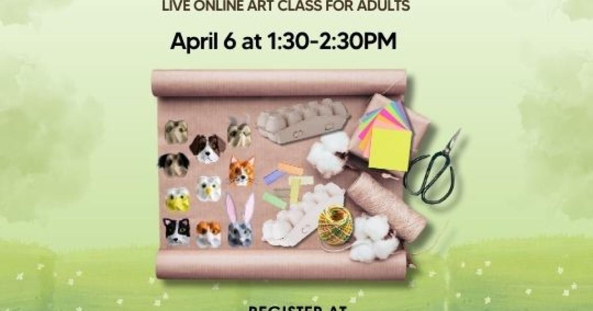 Join us online for a creative virtual workshop where recycled materials come to life. Participants will transform egg cartons and cardboard into a unique 3D animal portrait, shaping, assembling, and painting a spring-inspired creature full of personality. Gather a few simple supplies at home and get ready to craft along in this fun, hands-on online class.