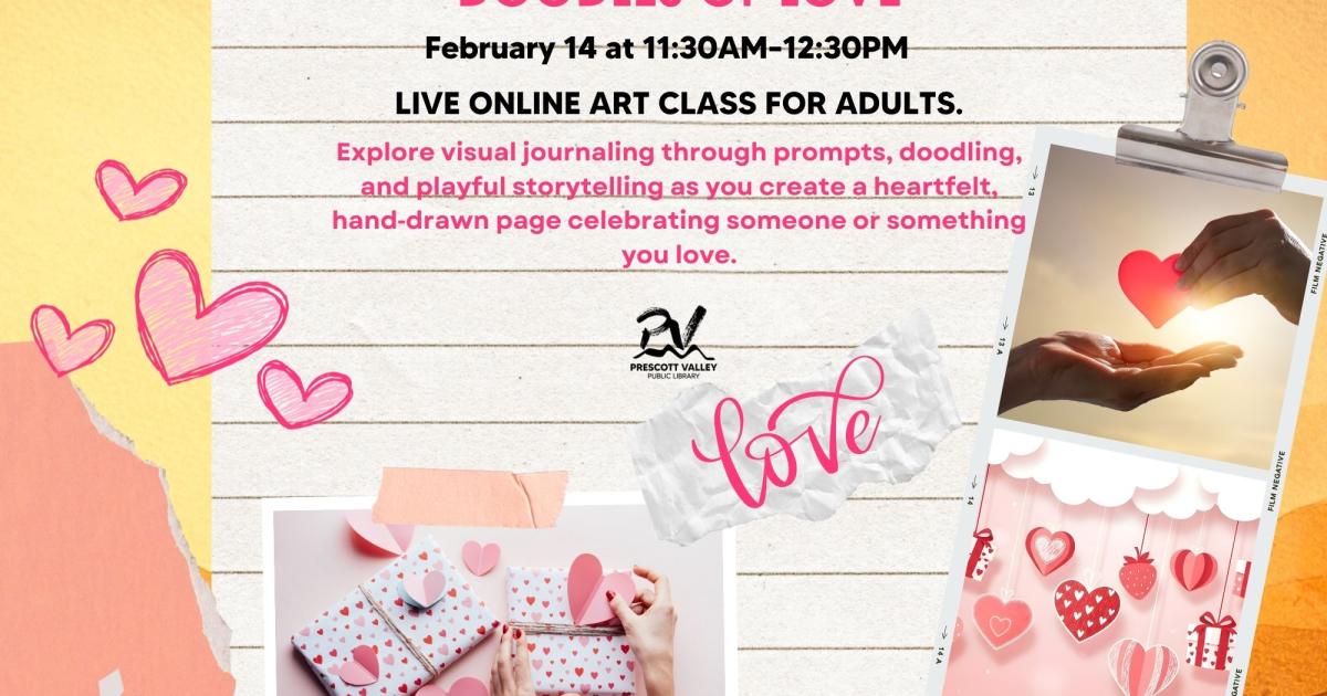Prescott Valley Public Library in partnership with Silverkite Community Art Classes presents Visual Journaling: Celebrating Love with Doodles from 11:30AM-12:30PM on Saturday, February 14, 2026. This is a virtual, live online art class for adults.