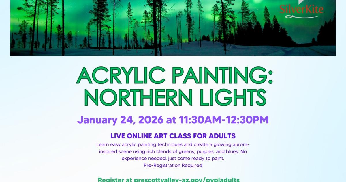 Prescott Valley Public Library in partnership with Silverkite Community Art Classes presents Acrylic Painting: Northern Lights in Colored Pencil from 11:30AM-12:30PM on Saturday, January 24, 2026. This is a virtual, live online art class for adults.