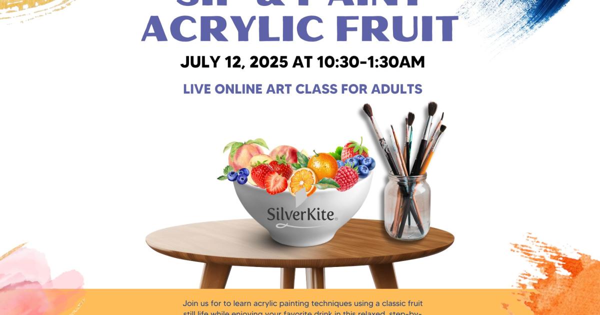 Prescott Valley Public Library in partnership with Silverkite Community Art Classes presents Sip & Paint Acrylics: Fruit, from 10:30- 11:30AM on Saturday, July 12, 2025. This is a virtual, live online art class for adults.