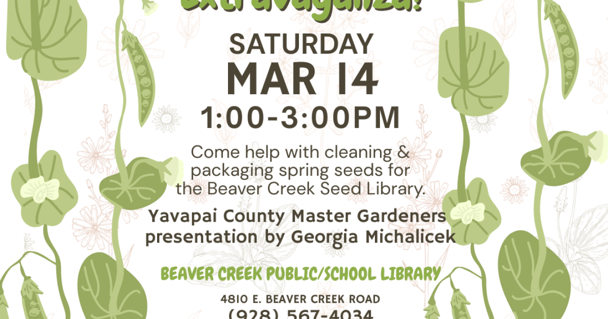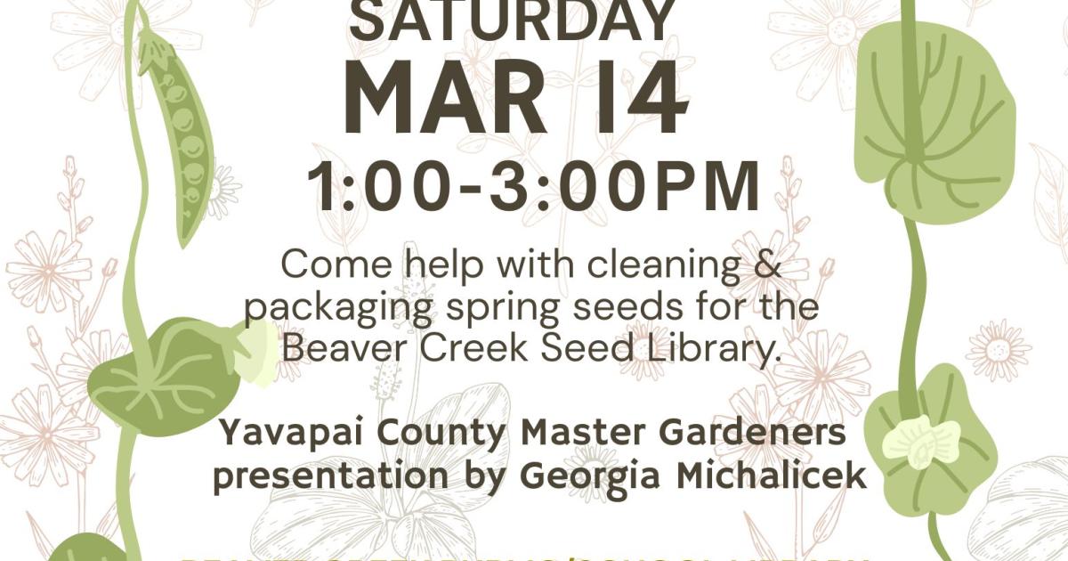 Primary tabs Upcoming List Month Week Day Remind Me Add To My Calendar Print Share Program Type: Home & Gardening, Science & Nature Age Group: College-Aged, Adults, Older Adults Program Description Event Details Come help with cleaning and packaging spring seeds for the Beaver Creek Seed Library, there will be a presentation by the Yavapai County Master Gardeners. Free and open to the public.