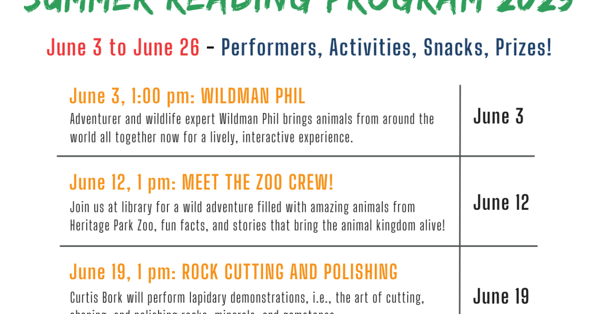 - Thursday, June 12, 1:00 pm: Join us at library for a wild adventure filled with amazing animals from Heritage Park Zoo, fun facts, and stories that bring the animal kingdom alive!