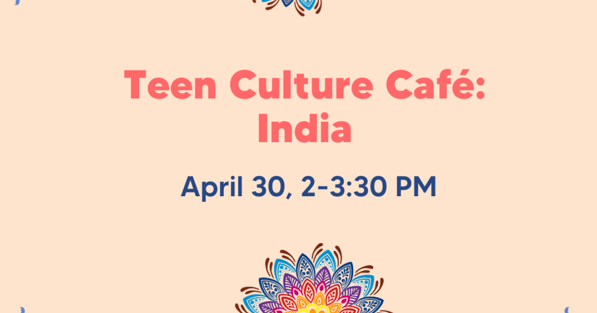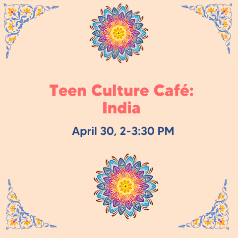 Join us for a special Teen Culture Café with a Mandala coaster craft, Indian snacks, a fun game, and more! Board games and coloring will also be available. We meet in the crystal room on the third floor.