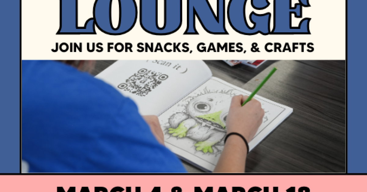 Lounge and hang out with your friends after school on the third floor of the library. Join us for snacks, games, coloring, and more. Registration is not required.