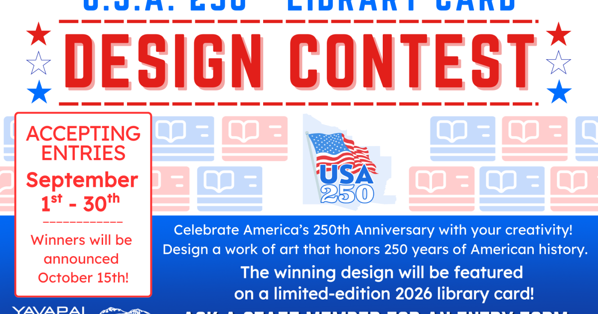 Your Art. America’s Story. One Epic Library Card. Design a work of art that honors 250 years of American history, culture, and spirit. The winning masterpiece will be featured on a limited-edition library card—a collectible piece of history! Make it bold, make it inspiring, and make it unforgettable. Together, let’s turn imagination into history! Visit https://ycfld.gov/node/252 or your local library for contest details.