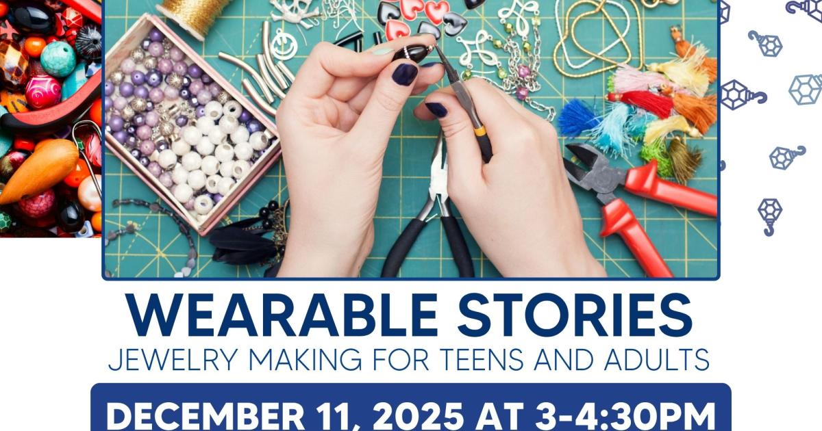 Join us for Wearable Stories, a joyful intergenerational jewelry-making workshop where teens and adults come together to design earrings and bracelets using a variety of beads, charms, and tools. Whether you're crafting a gift or a keepsake, this hands-on session encourages creativity, connection, and personal expression through wearable art. All materials are provided, and no experience is needed, just come ready to create, share stories, and add a little sparkle to the season.