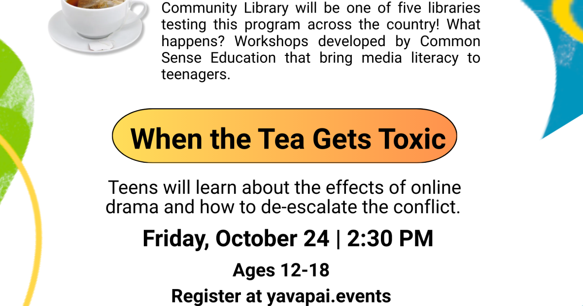 Introducing the Teen News & Media Literacy Pilot Program funded by the Carnegie Corporation of New York. Black Canyon City Community Library will be one of five libraries testing this program across the country! What happens? Workshops developed by Common Sense Education that bring media literacy to teenagers. In this workshop, teens will learn about the effects of online drama and how to de-escalate the conflict. Snacks and munchies provided by Common Sense Media and the BCC Friends.